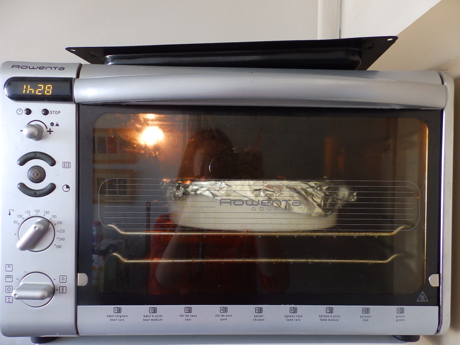 Below is my current oven, balanced (with great determination) on a smallish, sloped shelf.