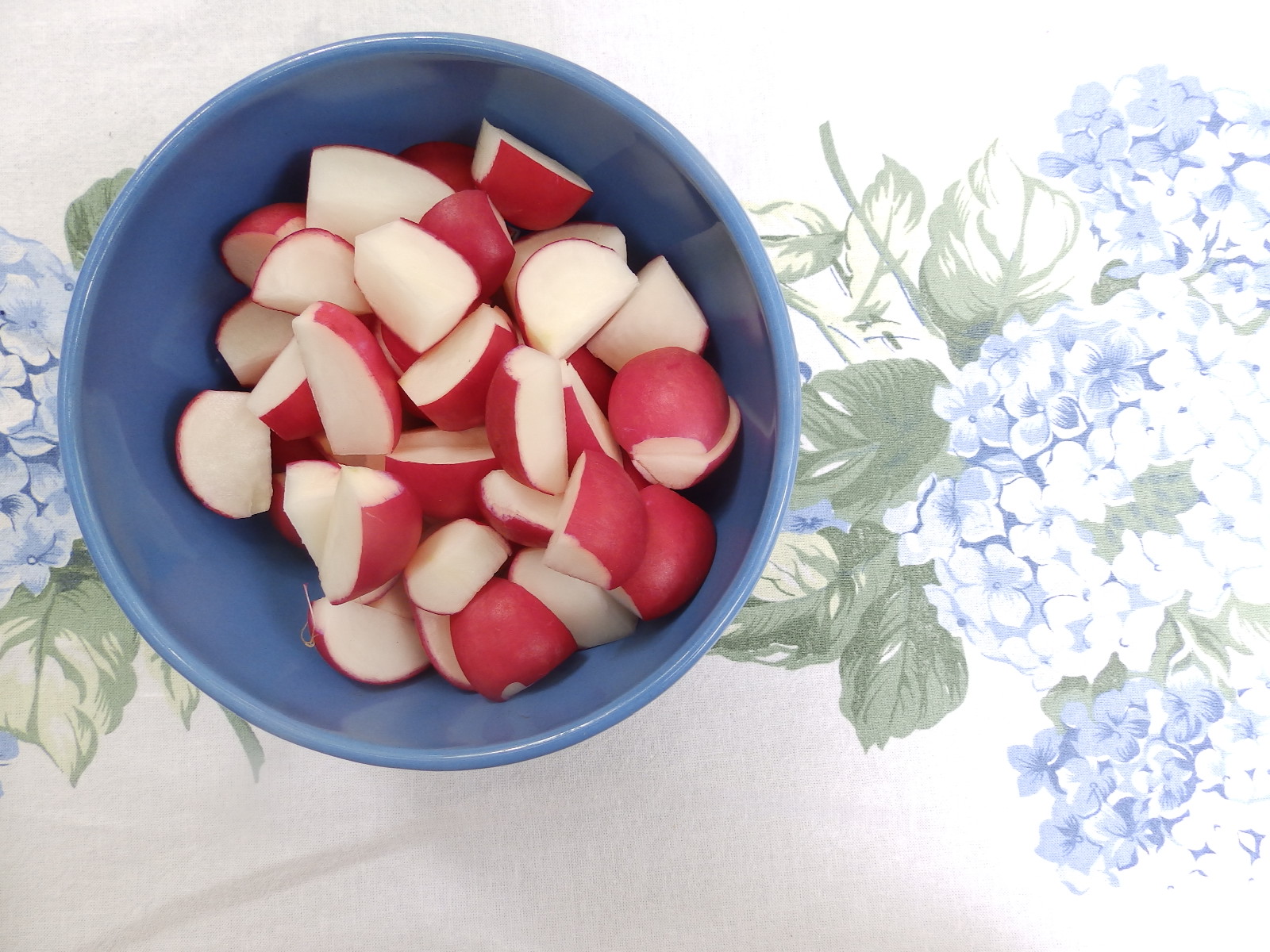 Use French breakfast radishes when you can find them. Remove their skirts (greenery) or leave them if you prefer. Rinse thoroughly. Serve with a pat of butter – the butter mellows the “fire” to which Crozier refers – and coarse sea salt. I use grey salt from Guérande, but if you’re feeling festive or flush, by all means use the fleur de sel.