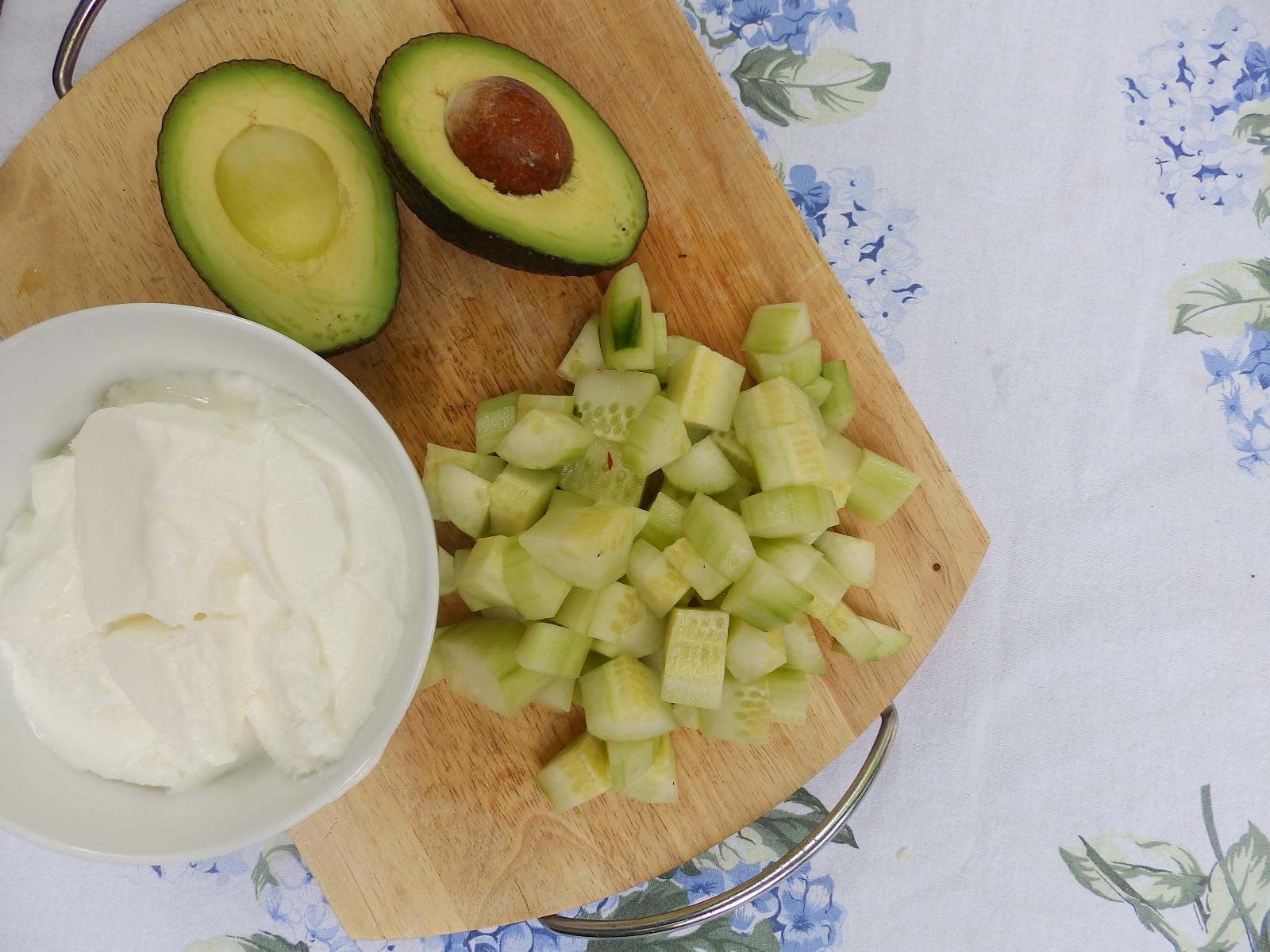 One English cucumber and 2 avocados, roughly chopped. 1 tub plain yoghurt (750g). Place all three ingredients in food processor. Blend. Add water to achieve desired thickness. Season with salt, pepper, and 1 tablespoon of white wine vinegar. Refrigerate for four to six hours.