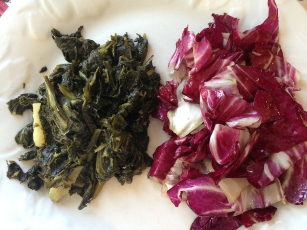 On the menu tonight, as a way of reconnecting to our roots: cooked radicchio, polenta and milk, and pasta al forno. (Not to be confused with lasagna or pasticcio, pasta al forno is a blend of cooked noodles, meat sauce and cheese. The mixture is laid out in a baking dish and cooked in the oven for about an hour or until the top is crusty).